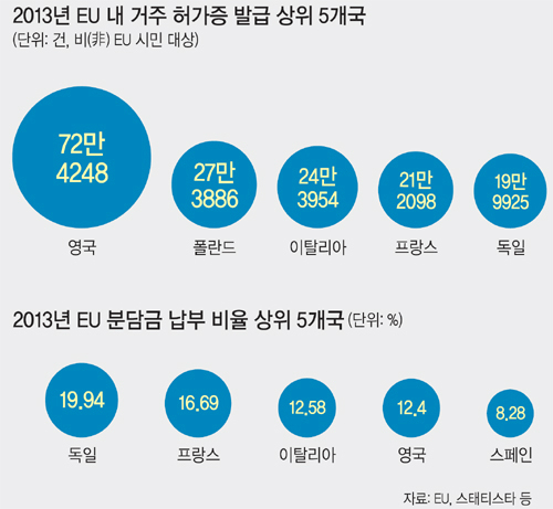 캐머런 총리는 “다른 회원국들의 분담금보다 많다”며 “납기 안에 내는 일은 없을 것”이라고 반발했다. 영국의 EU 분담금은 지난해 86억2400만파운드로 EU 회원국 중 4위(12.4%)였다.
