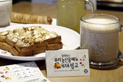 탐앤탐스는 국내산 대두를 사용한 우리 콩 메뉴와, 영월 농협의 아카시아 꿀, 고흥 농협의 유자, 상주 농협의 홍시 등 단위 농협과 제휴를 맺었다. 또 논산·정읍·영월 등 우리 지역 농가에서 생산한 재료를 사용한 우리 농산물 메뉴를 음료와 베이커리로 개발해 판매하고 있다. ‘우리농산물 4X4 빙고’ 이벤트는 탐앤탐스가 개발한 다양한 우리농산물 메뉴를 먹고 도장 쿠폰북의 빙고를 완성하면 푸짐한 경품을 증정한다.