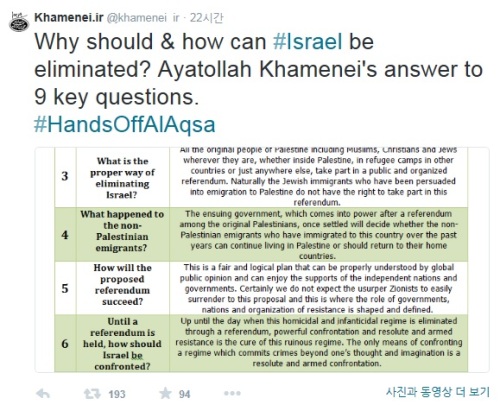 하메네이는 9일(현지시간) 자신의 공식 트위터 계정(@khamenei_ir)에 ‘이스라엘 제거에 관한 9가지 핵심 질문’이라는 글을 올려 이스라엘을 왜 없애야 하고 어떻게 제거할 수 있는지에 대한 자신의 견해를 밝혔다. 그는 “내가 66년을 살면서 관찰한 결과 그 가짜 시온주의 체제(이스라엘)는 폭력과 살인, 철권통치를 통해 자신의 목표를 실현하려 노력해 왔다”며 “이스라엘의 범죄를 종식시키는 유일한 방법은 이스라엘 체제를 없애는 것”이라고 주장했다.
