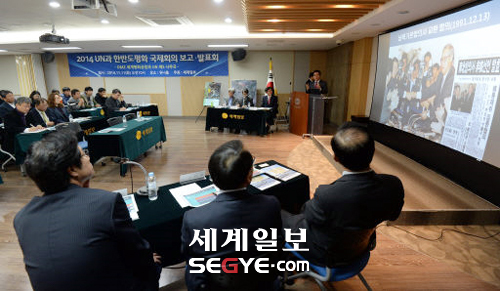 | 11일 서울 종로구 신문로 세계일보 유니홀에서 열린 ‘2014 유엔과 한반도 평화 국제회의 보고·발표회’에서 김근식 경남대 교수, 추규호 한국외교협회 부회장, 윤황 선문대 교수 등 패널과 참석자들이 유엔 제5사무국의 한반도 유치 의미와 방안에 대해 논의하고 있다. 김범준 기자 |