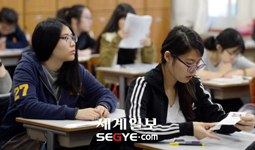| 2015년도 대학수학능력시험이 실시된 13일 오전 서울 풍문여고에서 수험생들이 긴장 어린 표정으로 시험 시작 종을 기다리고 있다. 김범준 기자 |