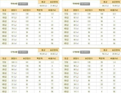 입시업체들은 2015학년도 대학수학능력시험에서 수학 B형의 1등급 커트라인을 평균 99점,국어 A형의 1등급 커트라인은 원점수 기준으로 평균 97점, 국어 B형은 91점으로 예상하고 있다.
