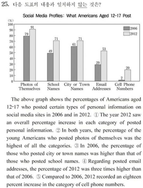 영어 25번 문항은 미국 청소년들의 소셜미디어 이용 실태를 분석한 도표를 보고 틀린 부분을 찾는 것이다. 평가원은 이 문제의 정답을 ④번으로 발표했다. 그러나 ⑤번 보기에서 2%에서 20%로 증가한 것을 표현하기 위해서는 ‘%포인트’를 사용해야 하는데, 단순히 ‘%’로만 표기해 출제 오류라는 지적이 일었다.