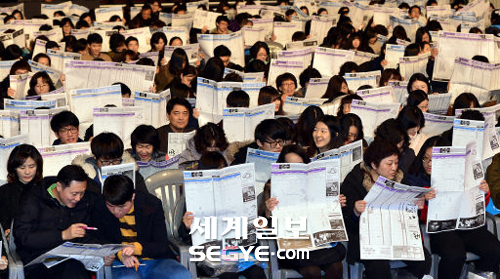 | “어디에 지원할까” 17일 서울 잠실실내체육관에서 입시업체 메가스터디 주최로 열린 ‘2015 대입 최종지원전략 설명회’에 나온 수험생과 학부모들이 배치표를 보면서 강사의 지원 전략 설명을 듣고 있다. 이재문 기자 |