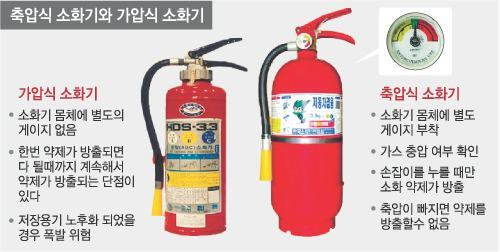 특히 펜션이나 아파트 등에 비치된 가압식 소화기가 가장 큰 문제점으로 지적되고 있다. 가압식 소화기는 1999년 생산 중단됐다. 주민들은 폭발 위험 등 안전사고를 우려하고 있다. 현재 시중 유통되고 있는 소화기는 손잡이 부분에 압력게이지가 부착된 축압식이다.