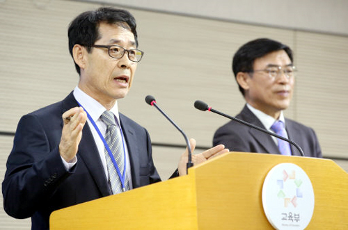 | 김성훈 한국교육과정평가원 원장(왼쪽)과 한석수 교육부 대학지원실장이 20일 정부세종청사에서 세계지리 8번 문항 오류와 관련된 성적 재산정 결과와 피해 학생 구제 방안을 발표하고 있다. |