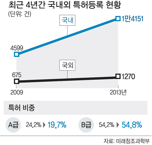 미래창조과학부와 한국과학기술기획평가원이 23일 발표한 ‘2009∼2013년 국가 연구·개발 성과 분석 결과’에 따르면 지난해 기준 국내 특허등록 건수는 1만4151건으로 2009년(4599건) 대비 207% 급증했다. 해외 특허등록 건수 역시 2009년 675건에서 지난해에는 1270건으로 88.1% 증가한 것으로 나타났다.