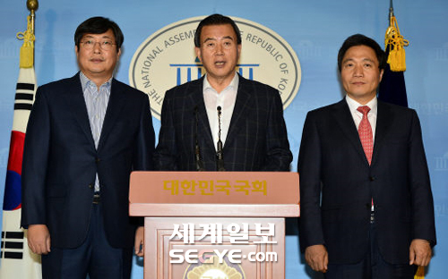 | 국회 예결특위 위원장인 새누리당 홍문표 의원(가운데)이 30일 오후 국회 정론관에서 여야 간사인 새누리당 이학재(오른쪽), 새정치민주연합 이춘석 의원과 함께 기자회견을 열어 예결위 심사를 이틀 연장하겠다고 밝히고 있다. 이재문 기자 |