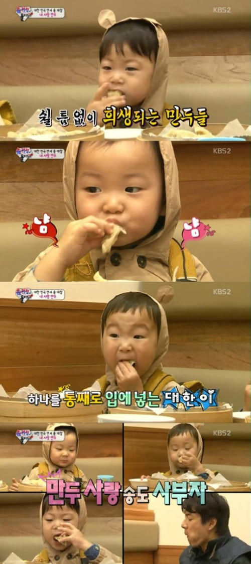 11월30일 방송된 KBS2 ‘해피선데이-슈퍼맨이 돌아왔다’에서는 송일국이 대한-민국-만세를 데리고 만두 가게를 찾았다.