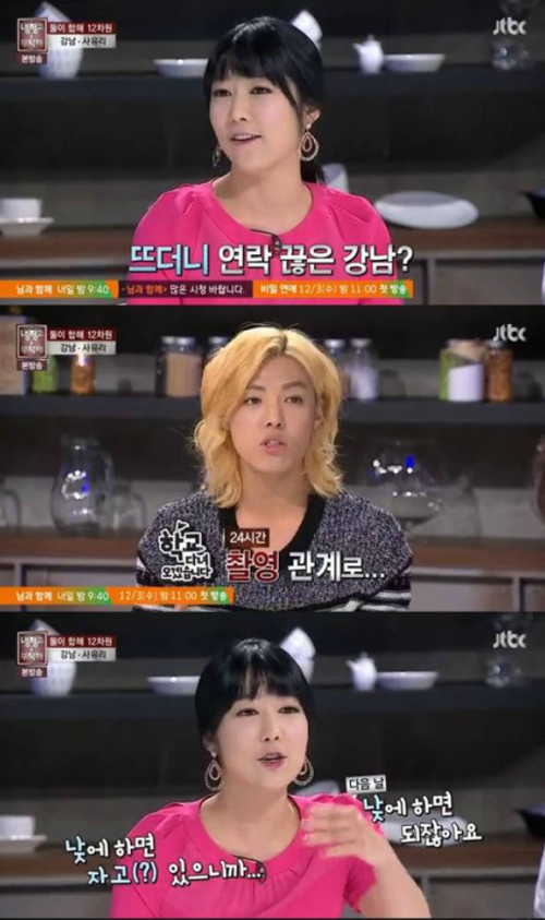 이에 MC진들이 "그럼 낮에 전화하면 되지 않냐"고 말했고, 강남은 "그 시간엔 누나가 자고 있다"고 답했다. 그러자 사유리는 "아니다, 네 전화를 기다리고 있었다"고 말해 웃음을 자아냈다.