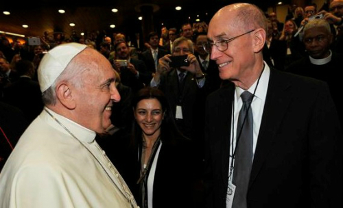 | 바티칸시티 종교회의 홀에서 열린 결혼에 대한 학회를 시작하며 프란치스코 교황(왼쪽)과 헨리 아이어링 예수그리스도교회 회장이 환한 얼굴로 인사를 나누고 있다. |