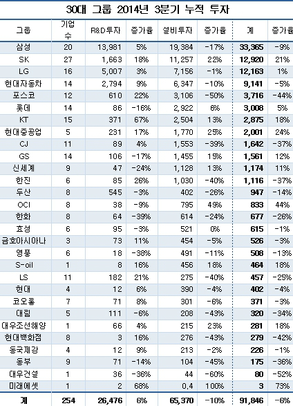 최근 CEO스코어가 30대 그룹의 분기보고서 제출기업 254개사를 대상으로 3분기 누적 설비투자와 R&D 투자 규모를 조사한 결과, 총 91조8500억원으로 지난해 같은 기간 97조5000억원에 비해 5.8% 감소한 것으로 집계됐다.