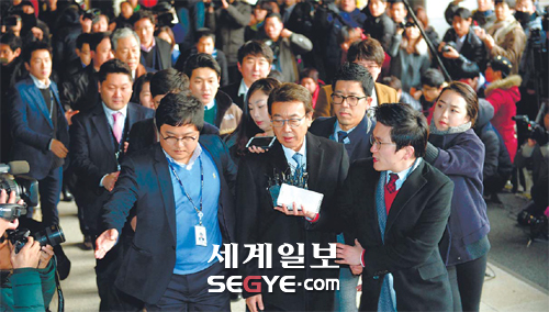 | 국정 개입 농단 의혹을 받고 있는 정윤회씨가 검찰 조사를 받기 위해 10일 서울중앙지검으로 들어서자 몰려든 기자들이 취재경쟁을 하고 있다. 이재문 기자 |