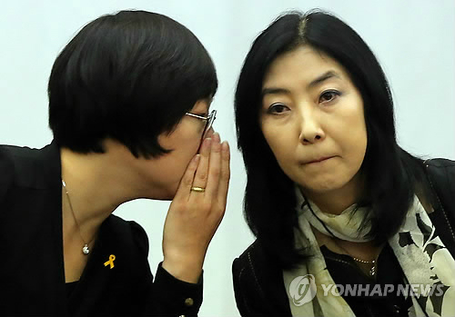 | 재미동포 신은미씨(오른쪽)와 황선 전 민주노동당 부대변인이 2일 서울 중구 프레스센터에서 열린 입장발표 기자회견에서 귀엣말을 나누고 있다. 연합뉴스 |