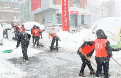 | 하나님의교회 성도들이 17일 목포시내 석현동우체국 앞에서 제설작업을 벌이고 있다. |