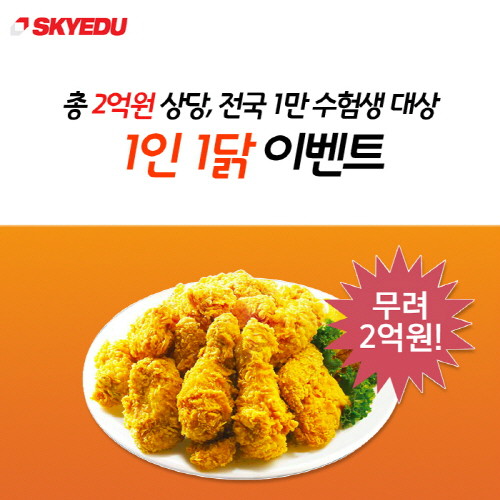 그 중에서도 성장률 1위를 달성한 스카이에듀의 이벤트가 눈에 띈다. 스카이에듀는 현재 수학 차영진, 영어 조은정, 수학 정상모 강사와 같은 스타강사의 신규 입성을 기념해 전국 1만명의 수험생을 대상으로 총 2억원 상당의 치킨 이벤트를 진행하고 있다.