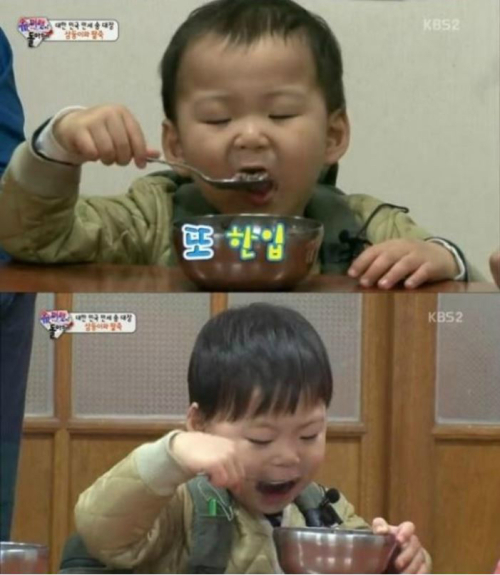 송일국은 삼둥이 대한-민국-만세과 함께 시골 체험기를 하며 식사시간에서는 동화책 '팥죽 할머니와 호랑이'에 나오는 팥죽 먹기에 나서 이른바 '팥죽 먹방'을 펼쳐 보였다.