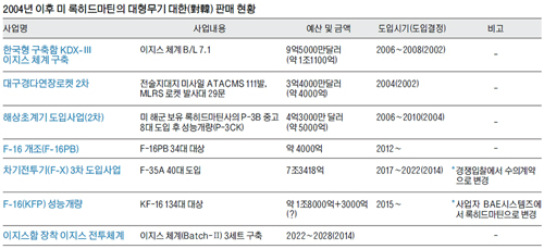 김대중정부와 노무현정부 시절 대형무기 사업을 독식하다시피했던 보잉이 주춤한 반면, 이명박, 박근혜정부 시기에는 록히드마틴의 약진이 두드러지고 있다.