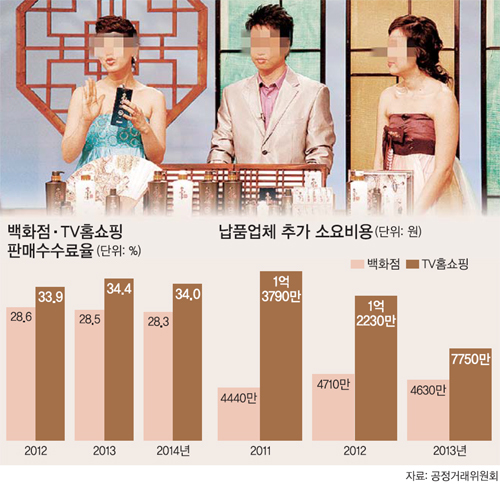 지난해 기준 백화점 납품업체 점포당 평균 추가 소요비용은 연 4630만원으로 파악됐다. 인테리어 비용이 4430만원으로 대부분을 차지하고 판매촉진비는 150만원, 광고비는 50만원이다. TV홈쇼핑 납품업체의 평균 추가 소요비용은 연 7750만원으로 2012년 1억2230만원에서 크게 줄었다. ARS 할인비가 3520만원, 무이자 할부비는 2610만원, 기타 판촉비는 1620만원이다.