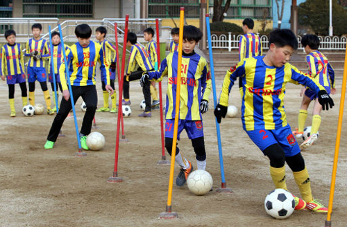 | 신북FC 유소년 선수들이 영하의 기온을 보인 28일 서울 신북초등학교 운동장에서 축구공을 몰며 막대 사이를 통과하는 드리블 훈련에 여념이 없다. |