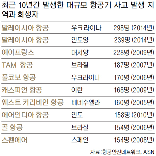 항공기 사고는 전반적으로 줄어드는 추세를 보이고 있다. 2005년에는 세계에서 항공기 사고로 1074명이 사망했다. 그러나 1970, 1980년대에는 항공기 이용자가 그 이후보다 훨씬 적었음에도 항공기 사고 희생자 숫자는 훨씬 더 많았다. 전 세계 200여 개 주요 항공사가 가입한 국제항공운송협회(IATA)의 통계에 따르면 올해 9월까지는 전 세계에서 100만 번 항공기 비행당 평균 추락사고 건수가 2.1건에 불과했다.