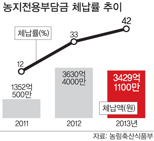 1일 기획재정부와 농림축산식품부에 따르면 이런 내용을 담은 농지법 개정안이 최근 국회에서 통과됐다. 농지보전금부담금은 아파트나 공장 설립 등을 하려고 농지를 전용하는 자에게 농지의 보전·관리 및 조성을 위해 ㎡당 공시지가의 30%(한도 ㎡당 5만원)를 부과하고 있다. 그러나 농지보전부담금을 제때 내지 않아 체납률(체납액·건수)이 2011년 12%(1352억500만원·1644건)에서 2012년 33%(3630억4000만원·1303건), 2013년 42%(3429억1100만원·1193건) 등으로 급증하고 있다. 2013년의 경우 한국토지주택공사(LH)의 광명·시흥공공주택지구(옛 보금자리지구) 체납액이 1832억원으로 가장 많았다. 민간단체 1312억1900만원(231건), 개인 284억9100만원(960건), 지자체 500만원(1건)이 뒤를 이었다.