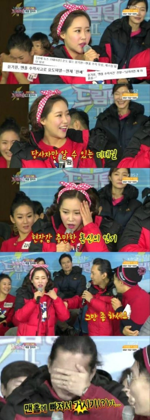 이에 아내 황은정은 "만화 같은 일들이 있었다"고 당시 기억을 떠올리면서 "윤기원이 데굴데굴 구르고 있더라. 급히 '어떤 남자가 맨홀에 빠져서 거시기.."라고 119에 신고했다"고 당시 상황을 적나라하게 전해 윤기원을 당황케 했다.