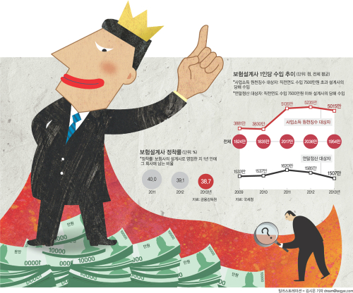 반면, 전년도 수입이 7500만원 이하인 설계사들은 연말정산을 하게 되는데 2013년엔 56만563명이 대상이었고, 1인당 평균 수입은 1507만원에 그쳤다. 2009년 1533만원에 비해 오히려 1.7% 수입이 감소한 것이다.