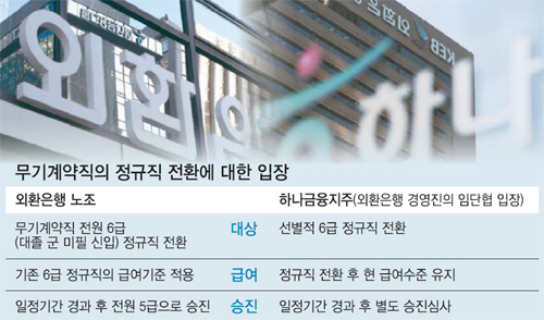 가장 큰 쟁점인 외환은행 무기계약직 2000명의 정규직 전환과 관련해 큰 틀은 노사가 합의한 상태다. 다만 정규직 전환시기와 급여수준, 승진 방식을 놓고 평행선을 달리고 있다. 노조 측은 윤용로 전 외환은행장과 김기철 전 외환은행 노조위원장이 2013년 10월29일 “무기계약 근로자를 2014년 1월 중 6급 행원으로 전환하기로 한다”고 합의서에 서명한 것을 근거로 “사측이 합의를 이행하지 않고 있다”고 비판한다.