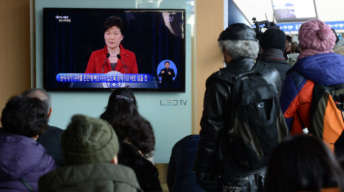 | 박근혜 대통령이 신년기자회견을 한 12일 오전 서울역 대합실에서 시민들이 TV를 통해 기자회견 방송을 지켜보고 있다. 남정탁 기자 |