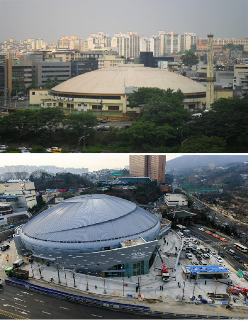 | 장충체육관이 단조로웠던 외관(위)을 탈피하고 춤과 놀이를 곡선으로 형상화한 모습으로 재탄생했다. |