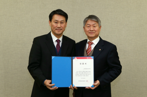 | 생산성본부 최상록 본부장(왼쪽)이 포철공고 황재호 교장(오른쪽)에게 인증서 전달 후 기념촬영을 하고 있다. |