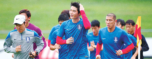 | 55년 만에 아시안컵 정상 탈환에 나선 신태용(왼쪽) 코치를 비롯한 기성용(가운데), 차두리 등 축구대표팀 선수들이 14일 호주 브리즈번 페리파크에서 비가 내리는 가운데 회복훈련을 하고 있다. 8강 진출을 확정 지은 대표팀은 오는 17일 오후 6시(한국시각) 호주와 A조 수위 자리를 놓고 일전을 벌인다. 브리즈번=연합뉴스 |