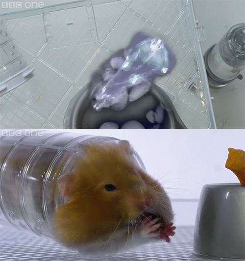공개된 영상에는 한 마리 햄스터가 작은 원형 투명한 튜브에서 나온다. 햄스터는 눈 앞에 놓여져 있는 견과류를 보자 마자 양 볼에 가득 채우기 바빴다. 양 볼에 가득 채우고 미처 넣지 못한 커다란 과일 조각은 입에 물고 다시 튜브로 들어가 다른 곳으로 이동한다.