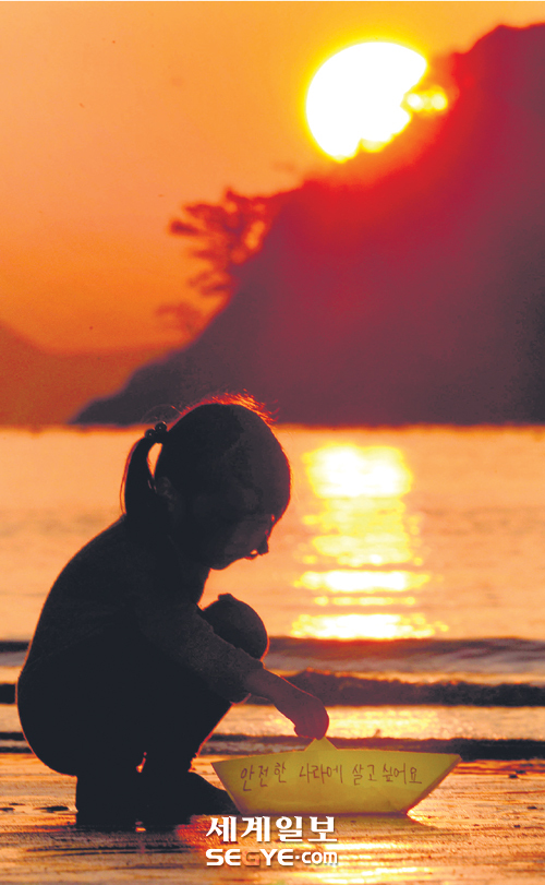 세계일보 김범준 기자의 사진 ‘안전한 나라에 살고 싶어요!’가 ‘제51회 한국보도사진전’ 시사스토리부문 우수작으로 선정됐다. 한국사진기자협회는 19일 500여점의 출품작 가운데 스팟뉴스, 제너럴뉴스, 피처 등 11개 부문 입선작을 발표했다. 수상작은 2월 10∼22일 동대문디자인플라자(DDP)에 전시된다. 김 기자의 사진 속 어린이는 전남 진도의 팽목항 부근 서망항에서 ‘안전한 나라에 살고 싶어요’라는 글이 적힌 노란색 종이배를 바다에 띄우고 있다.