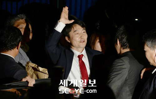 | 이석기 전 의원(가운데)이 국회 의원회관 앞에서 체포동의안 통과로 구인영장 집행에 나선 국정원 직원들의 호송차량에 오르면서 통진당(해산된) 당원에게 손을 들어 인사하고 있다. 세계일보 자료사진 |