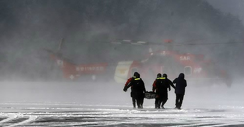 | 소방방재청 중앙119구조본부 동계 수난 구조 훈련. 얼음이 깨져 물에 빠진 시민을 구조한 가상의 상황에서 환자를 헬기로 신속히 이송하고 있다. 자료사진 |