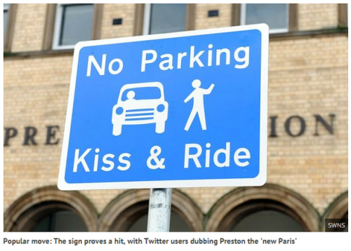 지난 21일(현지시각) 영국 미러 등 외신들에 따르면 프레스턴 기차역 앞에는 ‘No Parking, Kiss & Ride’라고 적힌 파란 표지판 하나가 서 있다. 이 표지판에는 무슨 의미가 담긴 것일까.