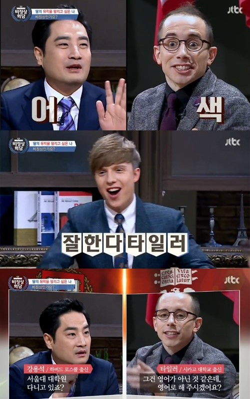 이날 방송에서 MC들은 "미국 하버드대에서 로스쿨을 다닌 강용석과 타일러가 영어로 토론을 해 보는것이 어떠냐"고 제안했다.