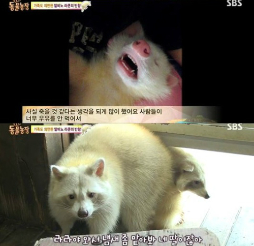 8일 방송한 SBS '동물농장'에서는 일반 라쿤과는 다른 50만분의 1의 확률을 뚫고 태어난 알비로 라쿤의 이야기가 그려졌다.