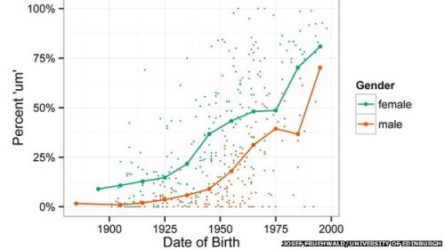 8일(현지시간) 영국 BBC방송에 따르면 조지프 프뤼월트 영국 에든버러대 교수 등 국제 공동연구진은 영어·독일어권에서의 각 유언휴지 사용빈도를 조사한 결과 1950년 출생자의 경우 um의 사용은 25%인 반면 2000년 출생자는 75%인 것으로 나타났다고 밝혔다. 2000년 출생자의 경우 여성의 um 사용률은 80%, 남성은 70%가량이었다.