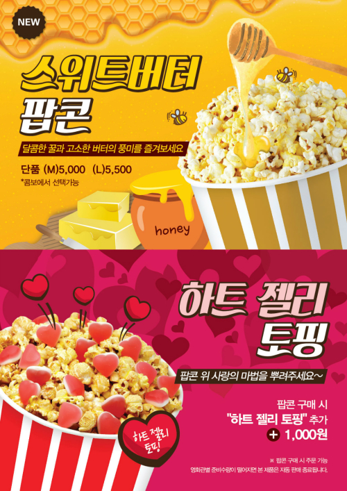 우선 최근 단맛의 ‘허니과자’가 스낵시장의 대세로 자리잡고 있는 것에 착안하여 달콤한 꿀과 고소한 버터의 풍미를 동시에 즐길 수 있는 ‘스위트 버터 팝콘’을 선보이며, 팝콘 위에 뿌려서 먹을 수 있는 ‘하트’ 모양의 토핑인 젤리와 프레즐 2종을 준비하여 골라먹는 즐거움을 선사할 예정이다.
