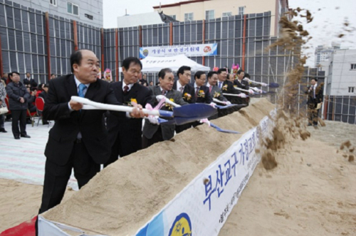 | 가정연합 부산산교구 겸 부산가정교회 신축 기공식 말미에 내빈들이 ‘무사 안전시공’을 기원하는 ‘시삽’ 의식을 치르고 있다. |