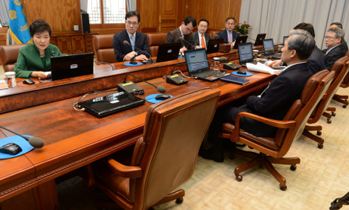 | 비어있는 비서실장 자리 박근혜 대통령이 23일 오전 청와대에서 수석비서관회의를 주재하고 있다. 사의를 표명한 김기춘 비서실장이 회의에 참석하지 않아 박 대통령 맞은편의 비서실장 자리가 비어 있다. 청와대사진기자단 |