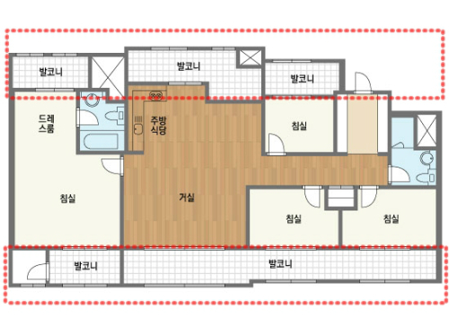 발코니는 통상 전면과 후면 또는 전면과 측면 등에 배치되는 2면 발코니 설계가 일반적이다.