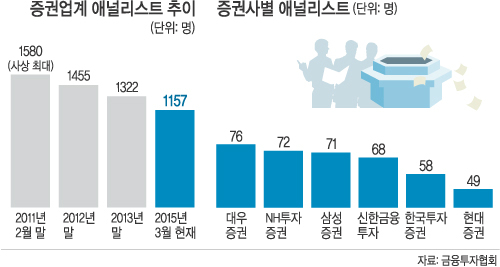 증권사별로는 대우증권이 76명으로 가장 많고 NH투자증권 72명, 삼성증권 71명, 신한금융투자 68명, 한국투자증권 58명, 현대증권 49명순이었다. 유화증권(3명), 리딩투자증권(4명), 흥국증권(5명), 부국증권(6명) 등 16개 증권사는 애널리스트가 10명 밑이었다.