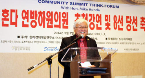 | 마이크 혼다 미국 연방하원 의원이 한·미경제개발연구소(KAEDC) 주최로 9일(현지시간) 캘리포니아주 로스앤젤레스에서 열린 초청 강연회에서 일본 정부의 과거사 반성을 촉구하고 있다. |