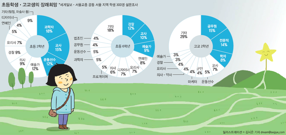 우리 청소년들은 초등학교 저학년만 해도 자신이 희망하는 미래를 꿈꾸지만 학년이 높아질수록 원래의 꿈은 온데간데없이 사라지고 안정된 삶을 추구하는 방향으로 변해가는 것으로 조사됐다. 세계일보가 최근 서울시교원단체총연합회의 도움을 받아 초등학교 저학년(2학년), 고학년(6학년), 고등학생(2학년) 300명을 대상으로 장래희망에 대한 설문조사를 한 결과다. 이런 세태가 20대의 공무원시험 열기, 인문학·이공계 기피 현상으로 이어지고 있는 것이다. 10대 청소년은 왜 어린 시절의 꿈을 버리고 있는 것일까.