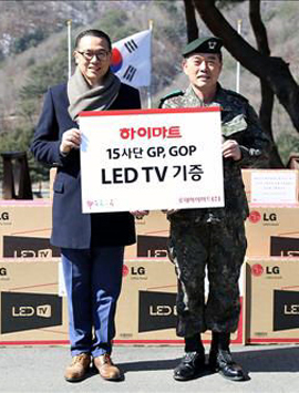 하이마트, 15사단에 위문품 전달 입력 : 2015-03-11 23:53:40 수정 : 2015-03-12 09:48:07 구글 네이버 유튜브 롯데하이마트 이동우 대표이사(왼쪽)가 10일 강원도 화천군 육군 15사단 사령부에서 최영철 사단장에게 장병들을 위한 LED(발광다이오드) TV 24대와 위문품을 전달한 후 기념촬영을 하고 있다. 이날 기증한 TV는 하이마트가 지난 2월 한 달간 LG 올레드(OLED) TV를 한 대 판매할 때마다 1만원씩 적립하는 ‘사랑의 기부’ 이벤트를 열어 모인 기부금으로 마련했다. 롯데하이마트 제공 Copyright ⓒ 세계일보. 무단 전재 및 재배포 금지 세계일보 김기환