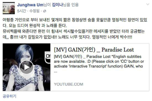 또 엄정화는 글과 함께 '하와'의 더블타이틀곡 중 하나인 '파라다이스 로스트'의 뮤직비디오의 링크를 첨부하며 가인의 신곡에 애정을 드러냈다.